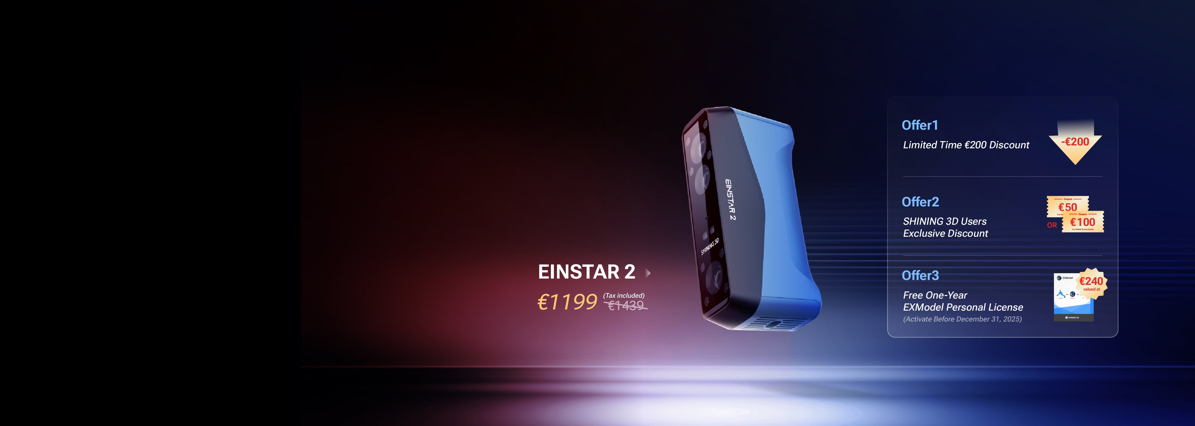 EINSTAR, powered by SHINING 3D with over 20 years of expertise in high-precision 3D digital products, inherits SHINING 3D's gene of innovation and advanced technology to push the boundaries of 3D scanning. Committed to making high-quality products accessible to every 3D explorer, EINSTAR is dedicated to unleashing the possibilities of each shining idea.