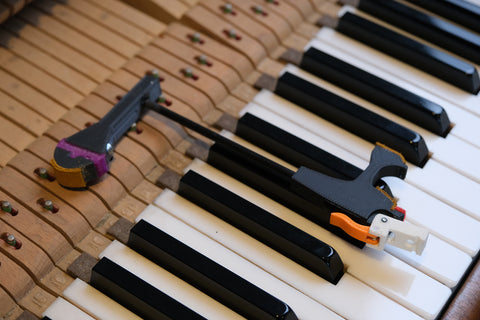 Each hammer must be scanned individually as they have different shapes, weights, and densities. The felt is replaced with materials like PLA or ABS and a silicone paw is placed on it to conform to the shape of the strings. The hammer prototypes are then printed using the 3D printer.