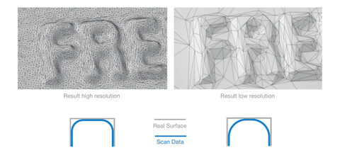 Die Auflösung definiert den Punktabstand, den der Scanner erfasst. Je kleiner der Abstand, desto höher die Auflösung und desto mehr Punktedichte in den Daten für bessere Details. Wenn Sie eine niedrige Auflösung wählen, ist der Punktabstand größer und es werden weniger Punkte generiert. Wir empfehlen, beim Scannen großer Objekte eine niedrige Auflösung einzustellen, um ein besseres Scan-Erlebnis zu erzielen.
