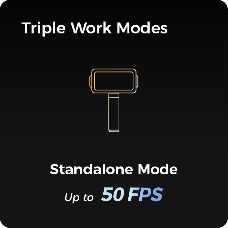 - Standalone-Modus – alle Scan- und Verarbeitungsaufgaben werden direkt auf der Hardware ausgeführt, was außergewöhnliche Portabilität und Benutzerfreundlichkeit bietet.