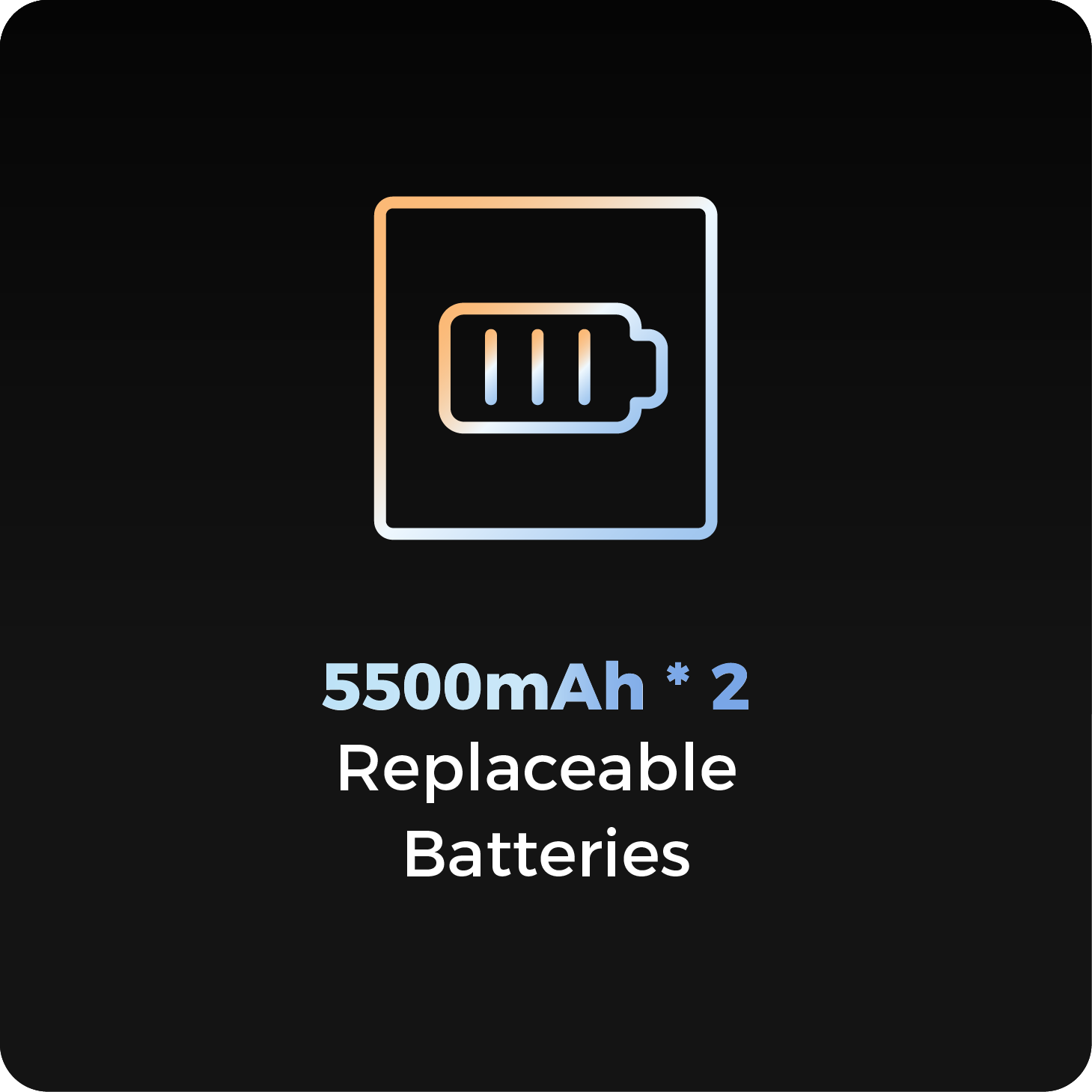 Das Gerät wird von zwei austauschbaren 6000-mAh-Akkus angetrieben, die schnell ausgetauscht werden können (derzeit ist jedoch kein Hot-Swapping möglich). Es unterstützt außerdem die Stromversorgung über USB Typ C während des Ladens und der gleichzeitigen Nutzung.
