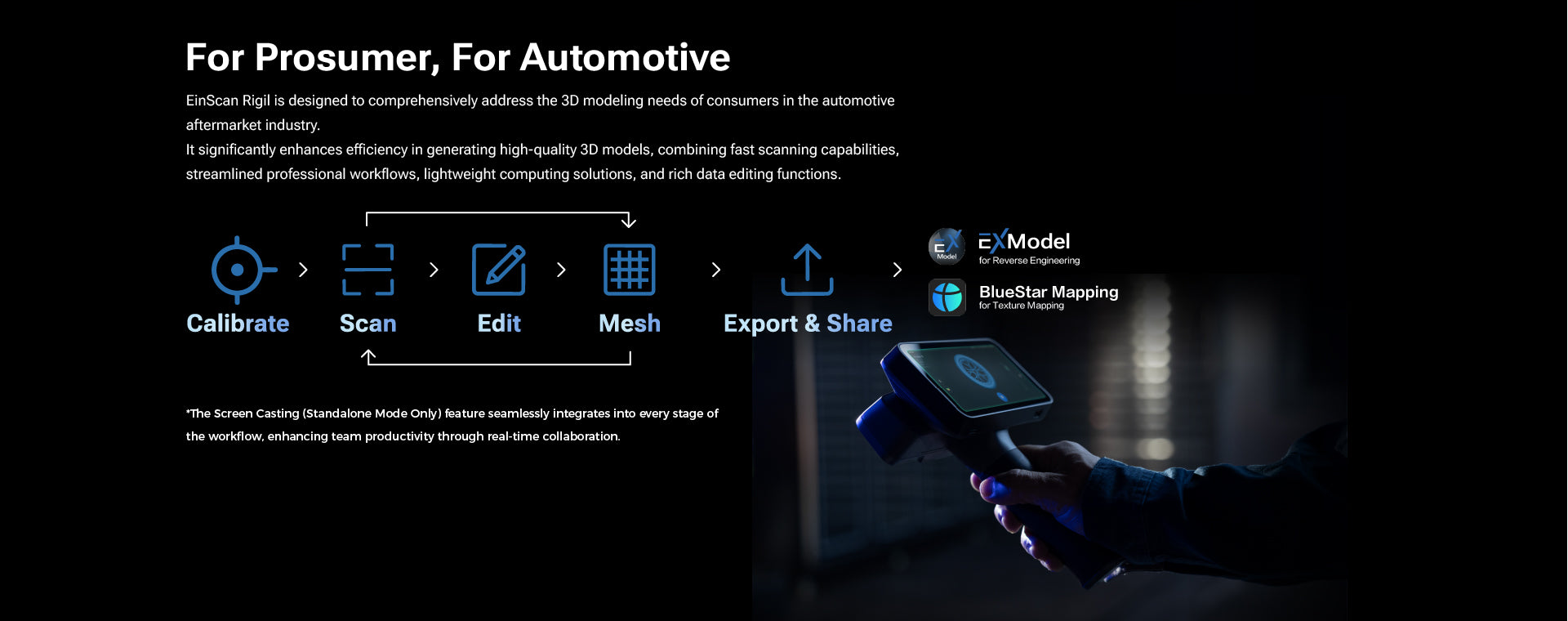 EinScan Rigil wurde entwickelt, um die 3D-Modellierungsanforderungen von Prosumenten im Kfz-Ersatzteilmarkt umfassend zu erfüllen. Es steigert die Effizienz bei der Erstellung hochwertiger 3D-Modelle deutlich und kombiniert schnelle Scanfunktionen, optimierte professionelle Arbeitsabläufe, schlanke Computerlösungen und umfangreiche Datenbearbeitungsfunktionen.