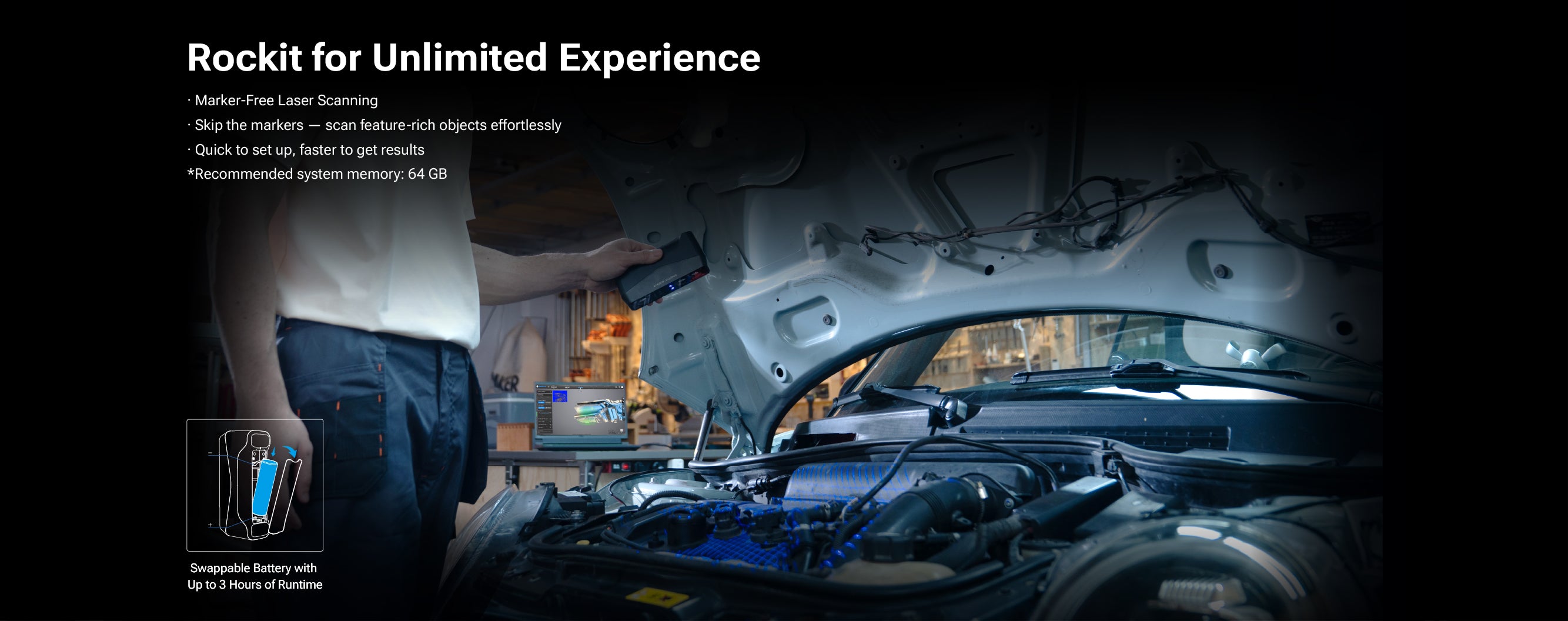 EINSTAR Rockit is a portable and high-efficiency 3D scanner ideal for users like product designers, Car engineers, 3D artists and makers. Its applications include automotive part scanning, digital art creation, AR/VR content production, and scanning outdoor objects like statues and sculptures.