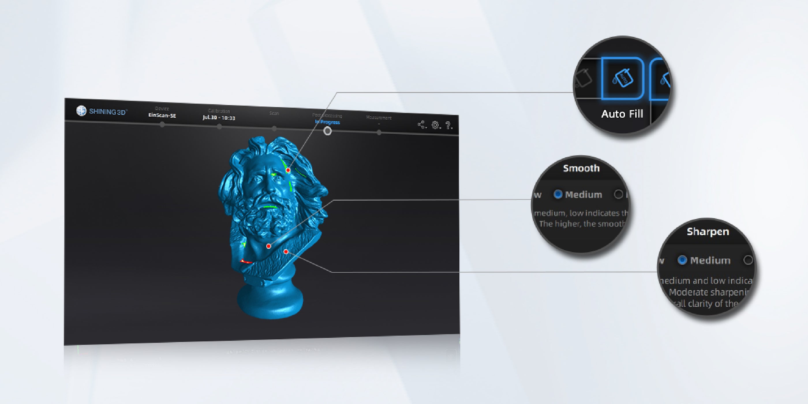 Software of EinScan-SE/SP V2 has the functions of filling holes, smoothing and sharpening, and can also readjust the data coordinates in the post-processing process to provide more perfect 3D data for subsequent applications.